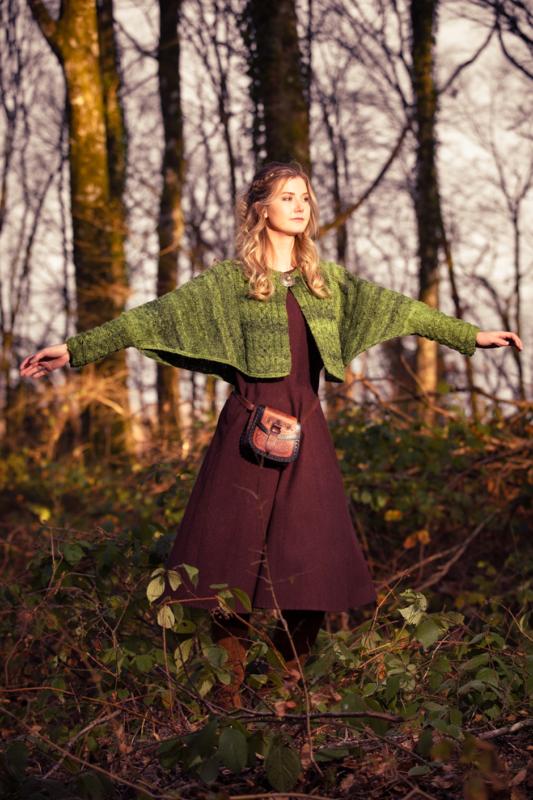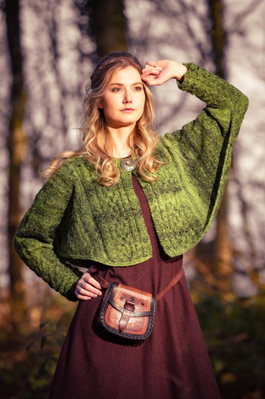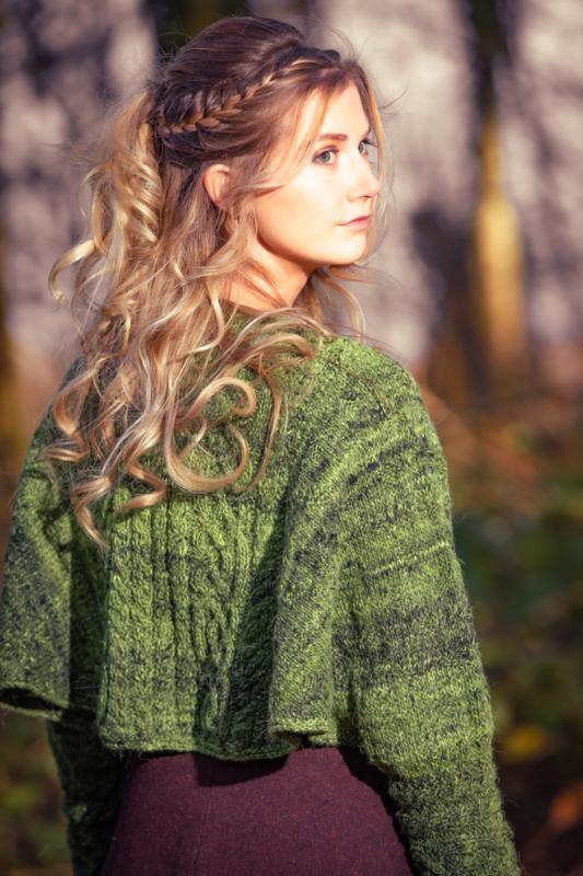 Le boléro Fougères est réalisé avec le fil Sanga (50% laine - 25% soie - 25% alpaga) col vert.