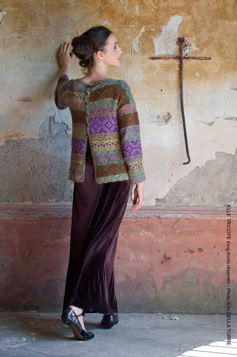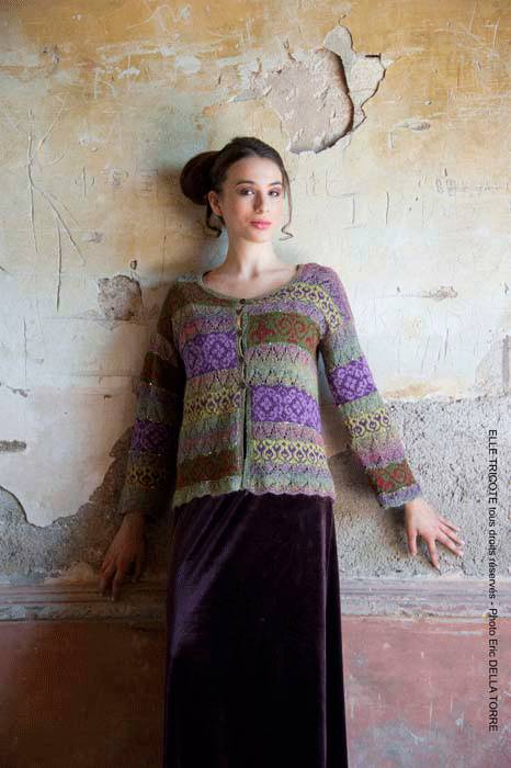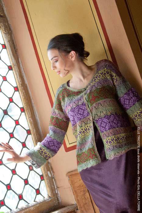 Le cardigan Eléonore est réalisé avec un fil chiné (soie, kid mohair) pour les motifs ajourés et en baby alpaga et laine pour les motifs de jacquard. Les motifs sont séparés par 2 rangs de point mousse tricotés avec un fil or.