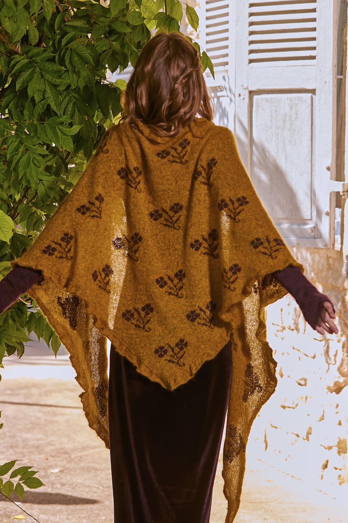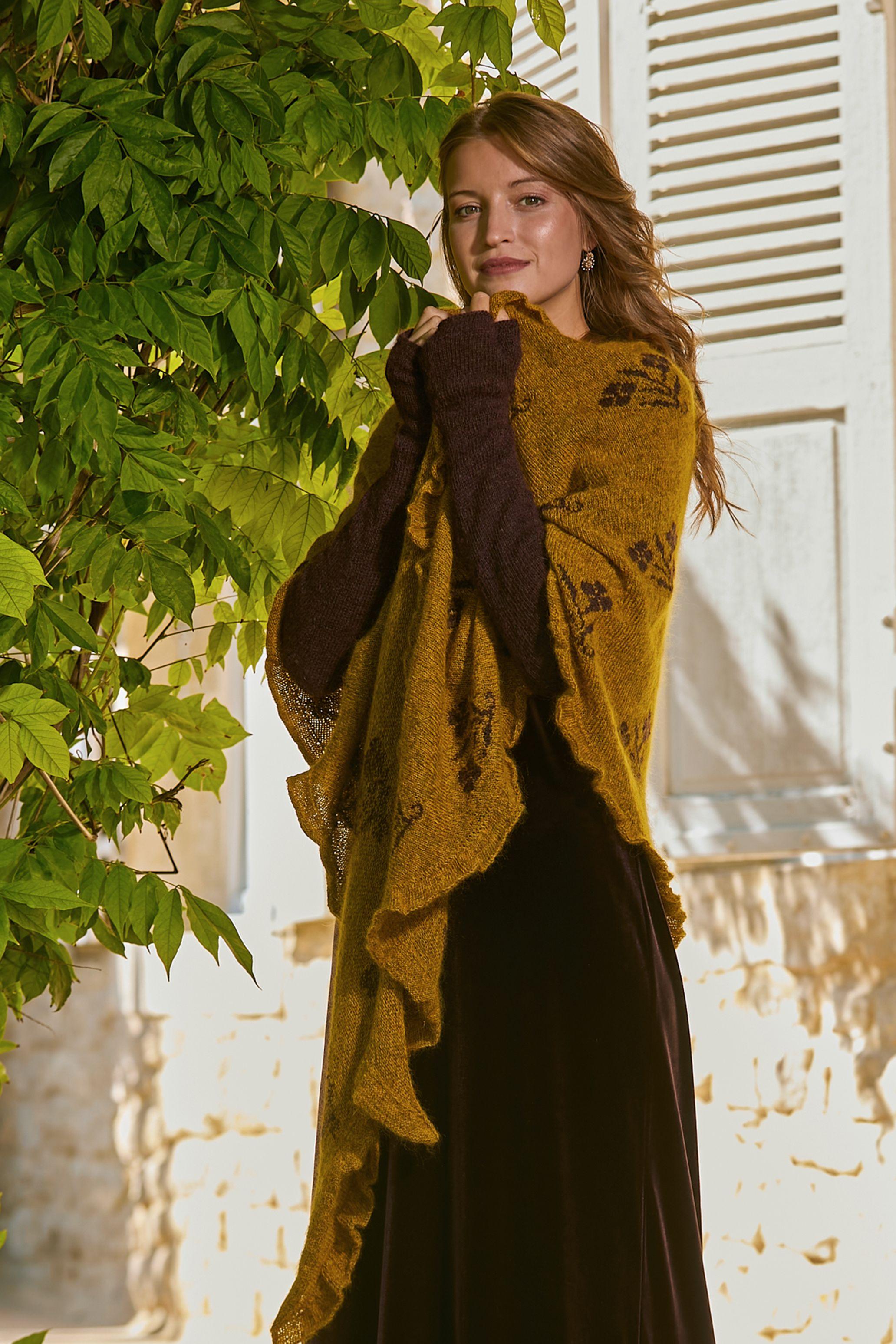 Le châle Alison est réalisé avec un fil jaune curry (laine, mohair et rayonne) et un fil prune (laine, mohair, rayonne, alpaga).