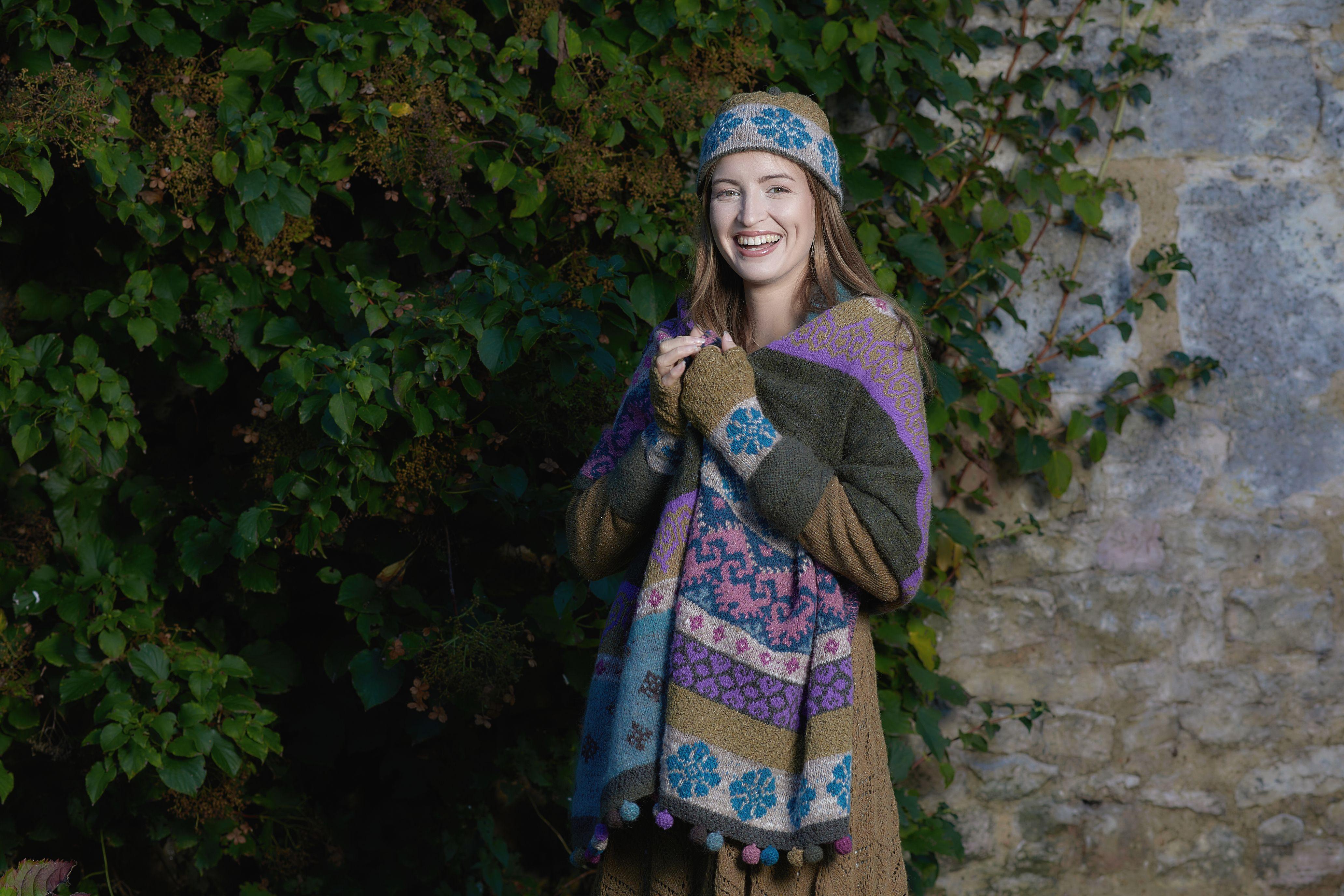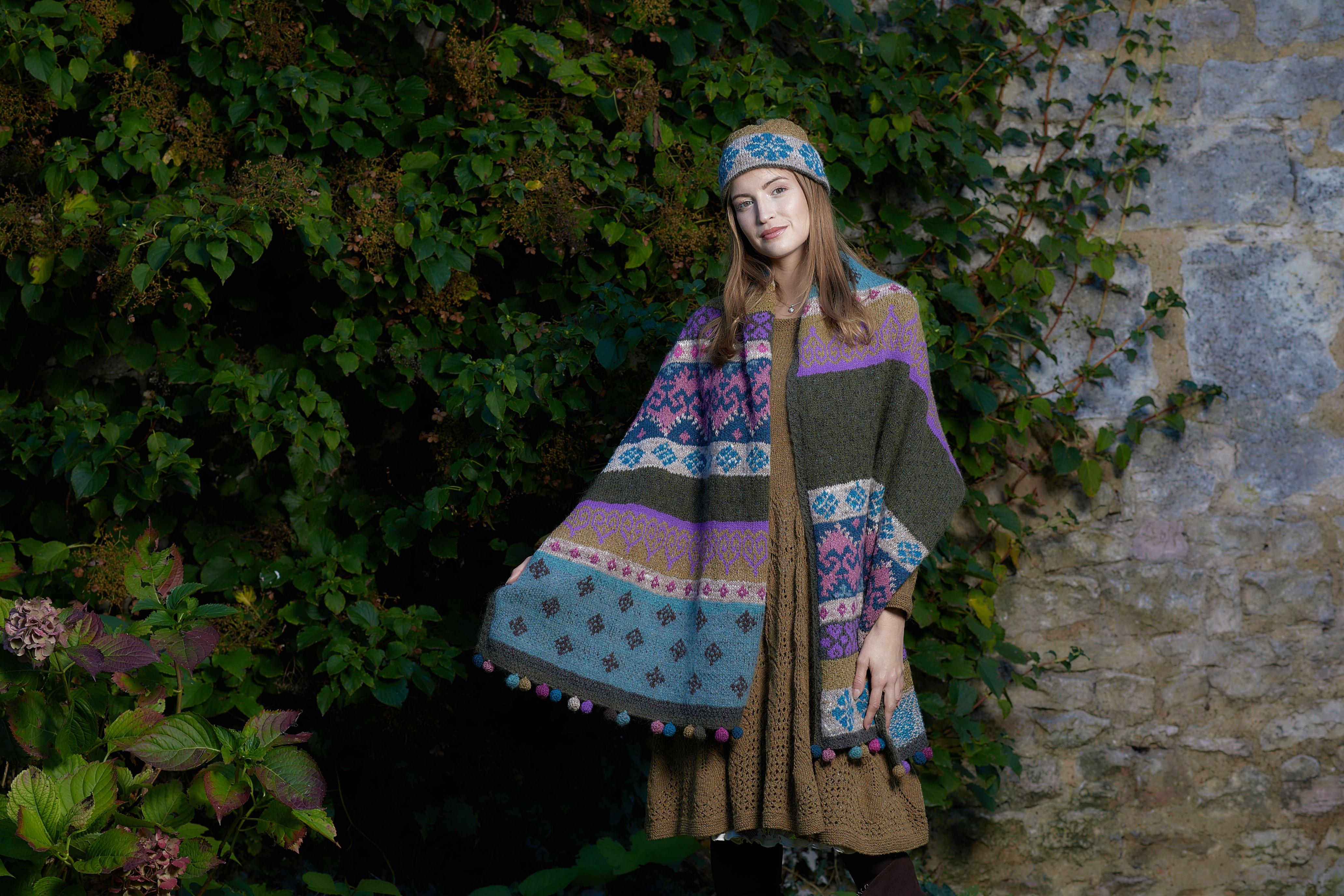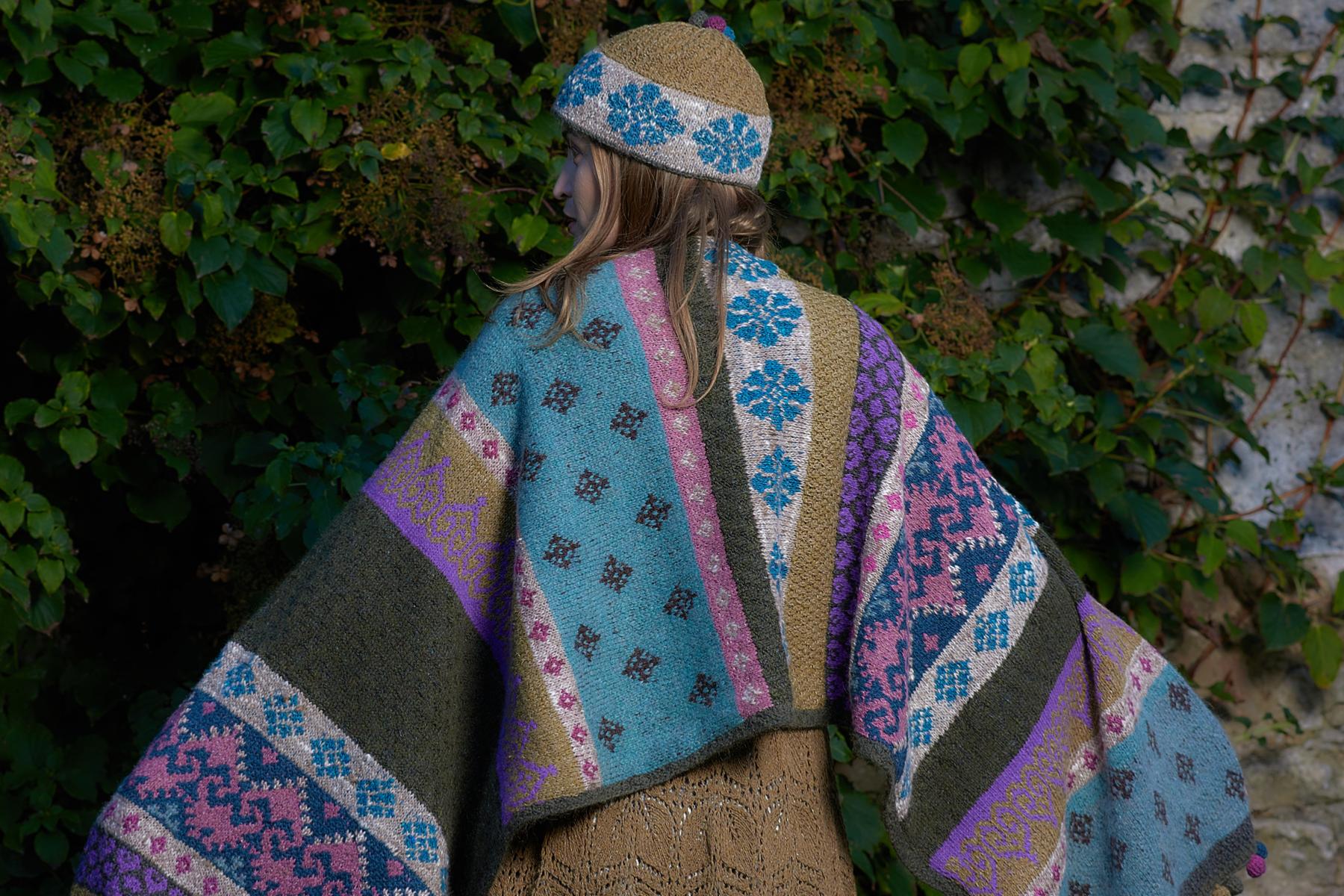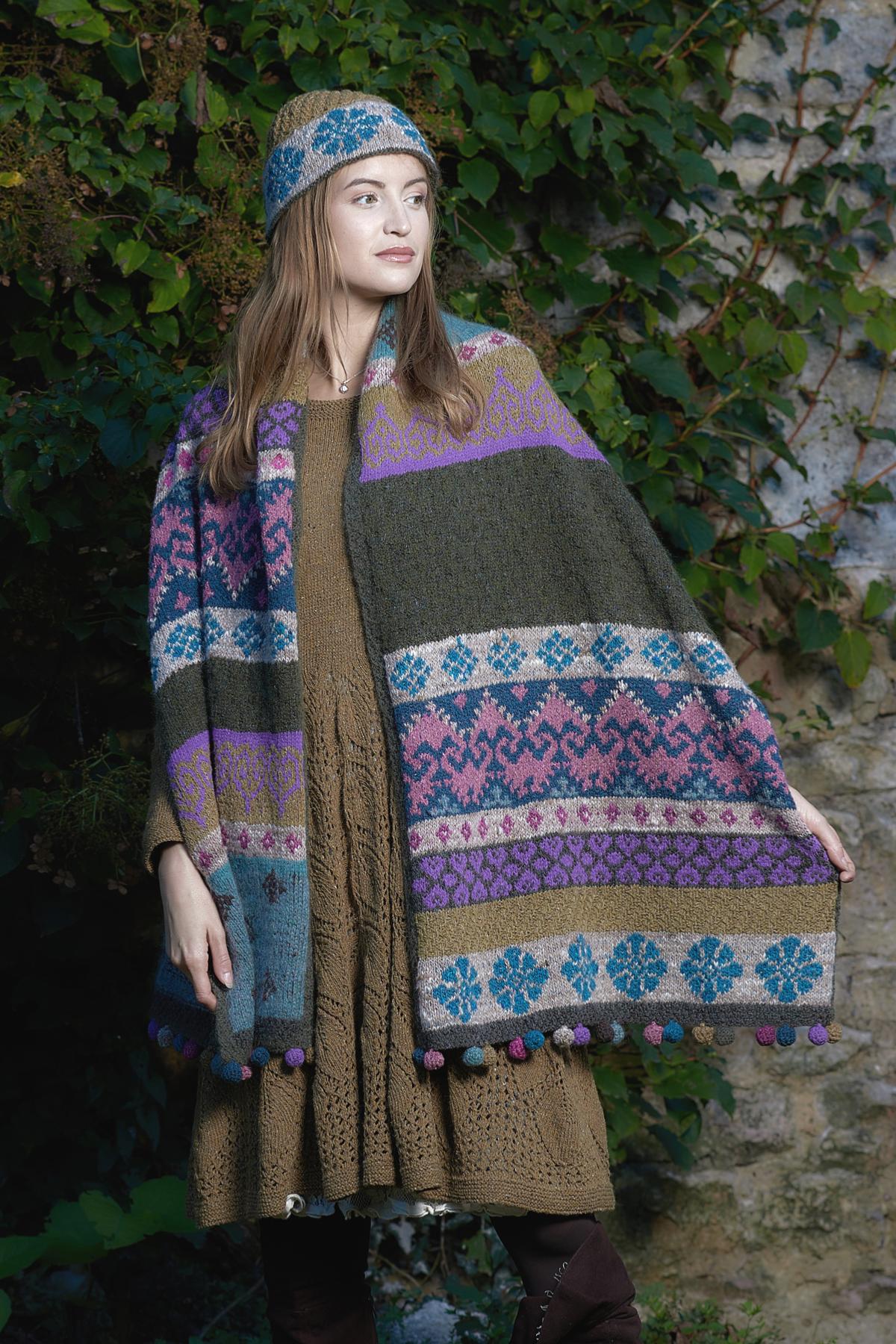 Une succession de rayures de jacquard tissé et de points structurés, des mailles rebrodées et des pompons pour border le tout. Les pompons sont crochetés puis remplis avec les chutes de laines.