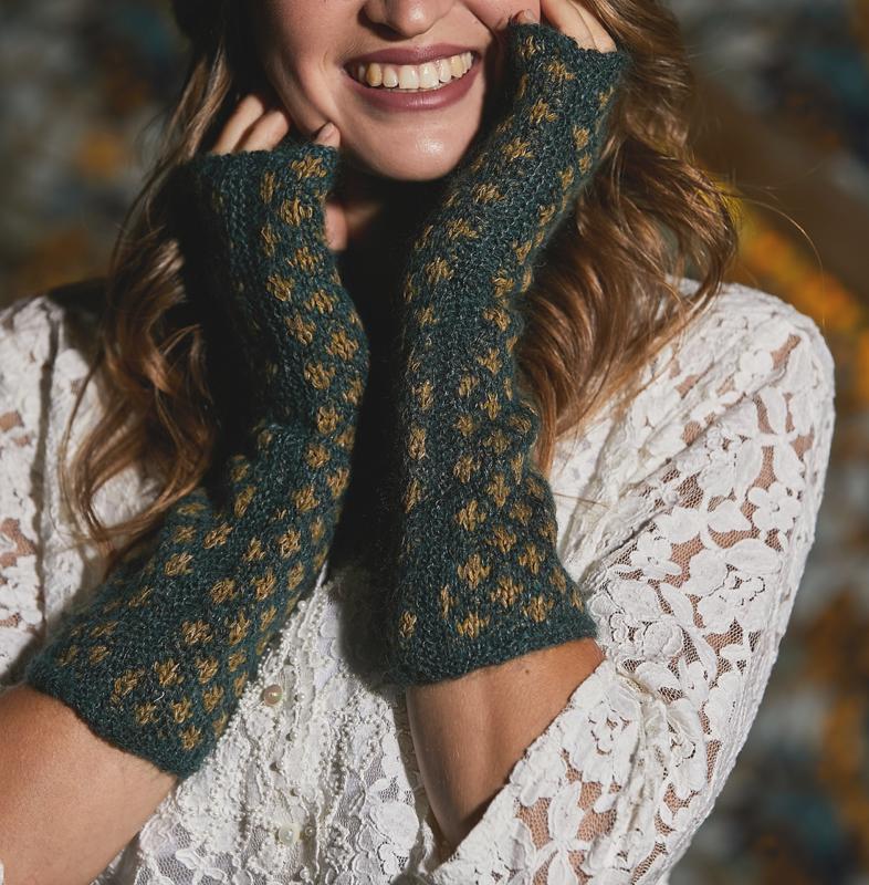 Les mitaines Elisabeth sont réalisées avec un fil couleur Storm et un fil couleur Bronze (ces fils sont composés de fil de pure laine, soie, mohair, rayonne).