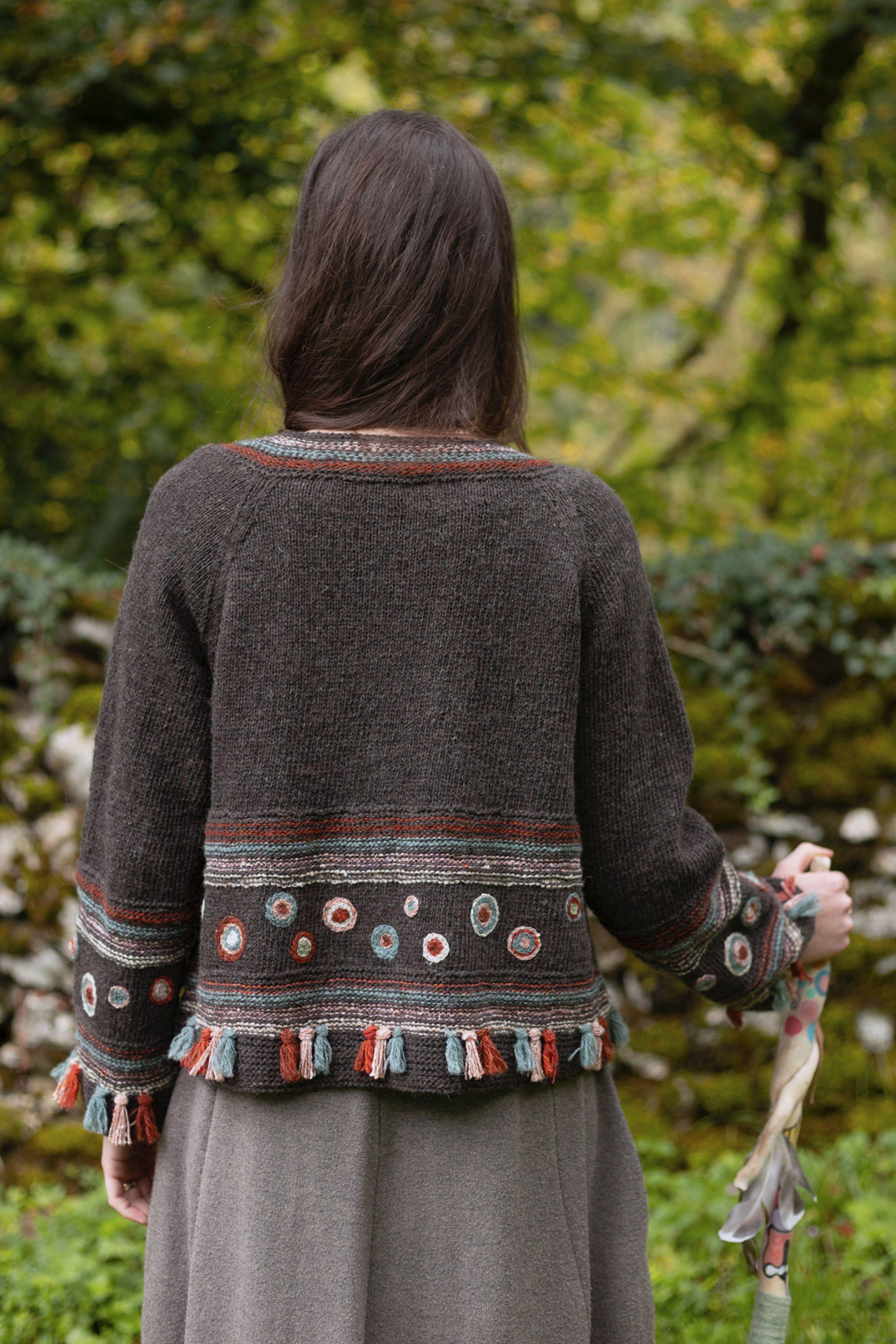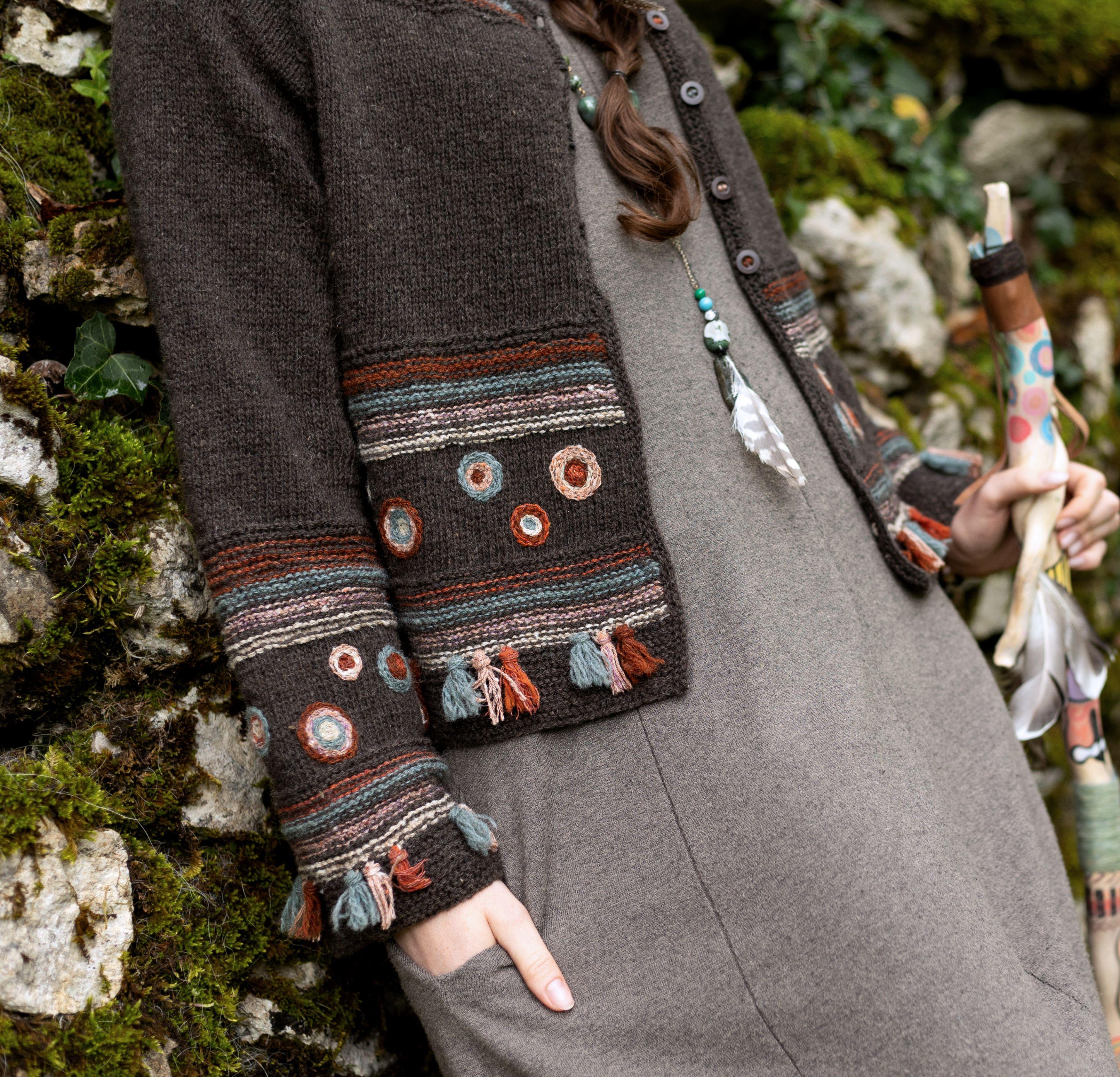Toutefois de par sa forme classique, elle pourrait très bien être réalisée sans les rayures, les broderies et les franges pour en faire une veste facile à porter et à assortir.
