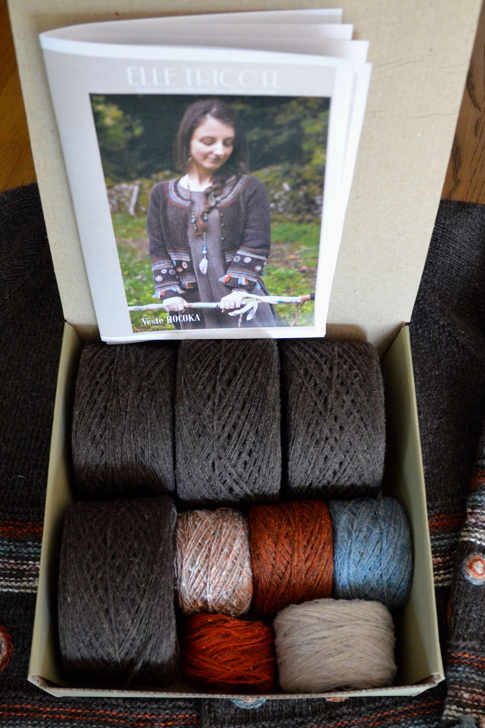 Le kit comprend : les fils en quantité nécessaire pour la veste, la fiche tricot