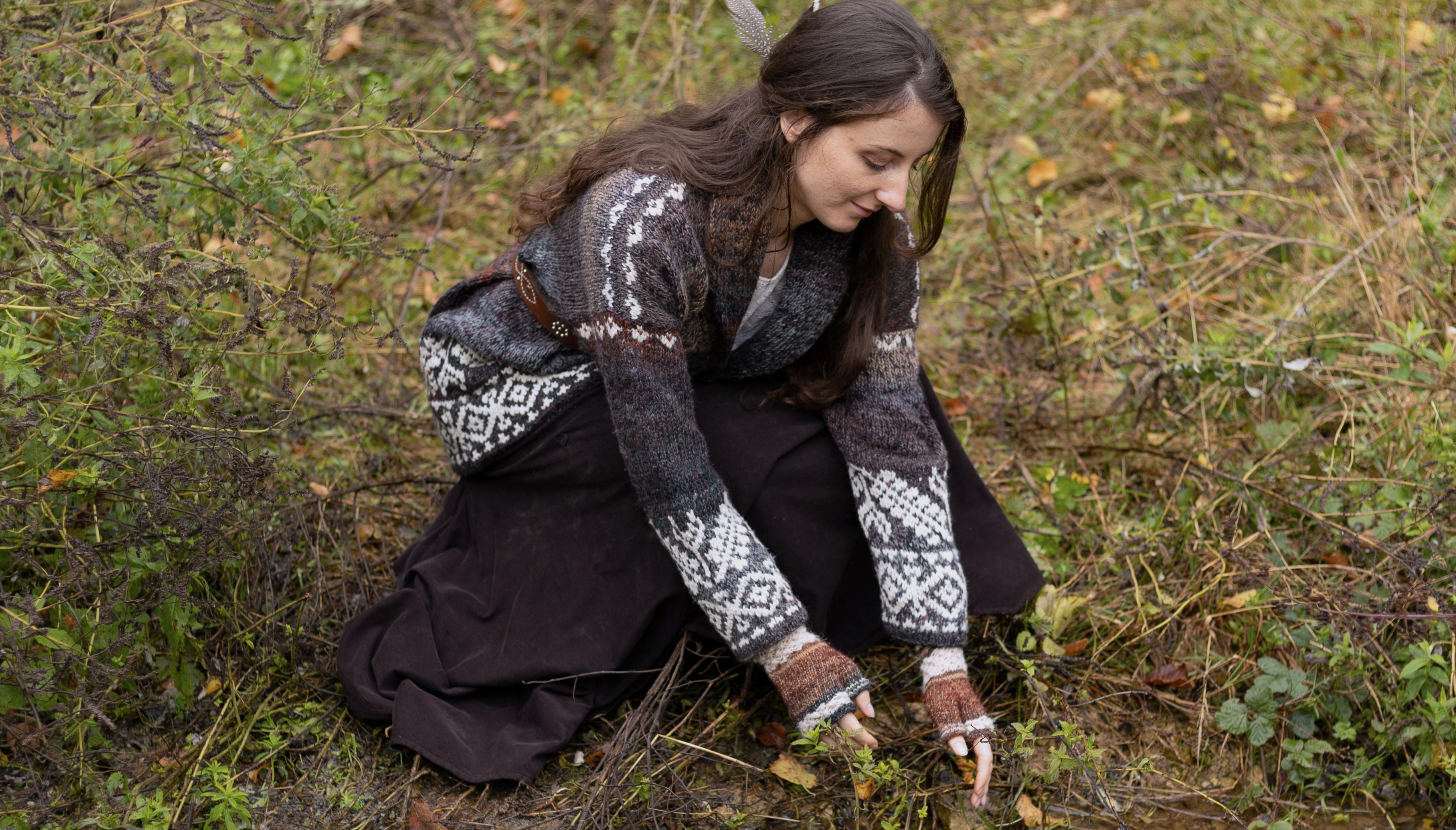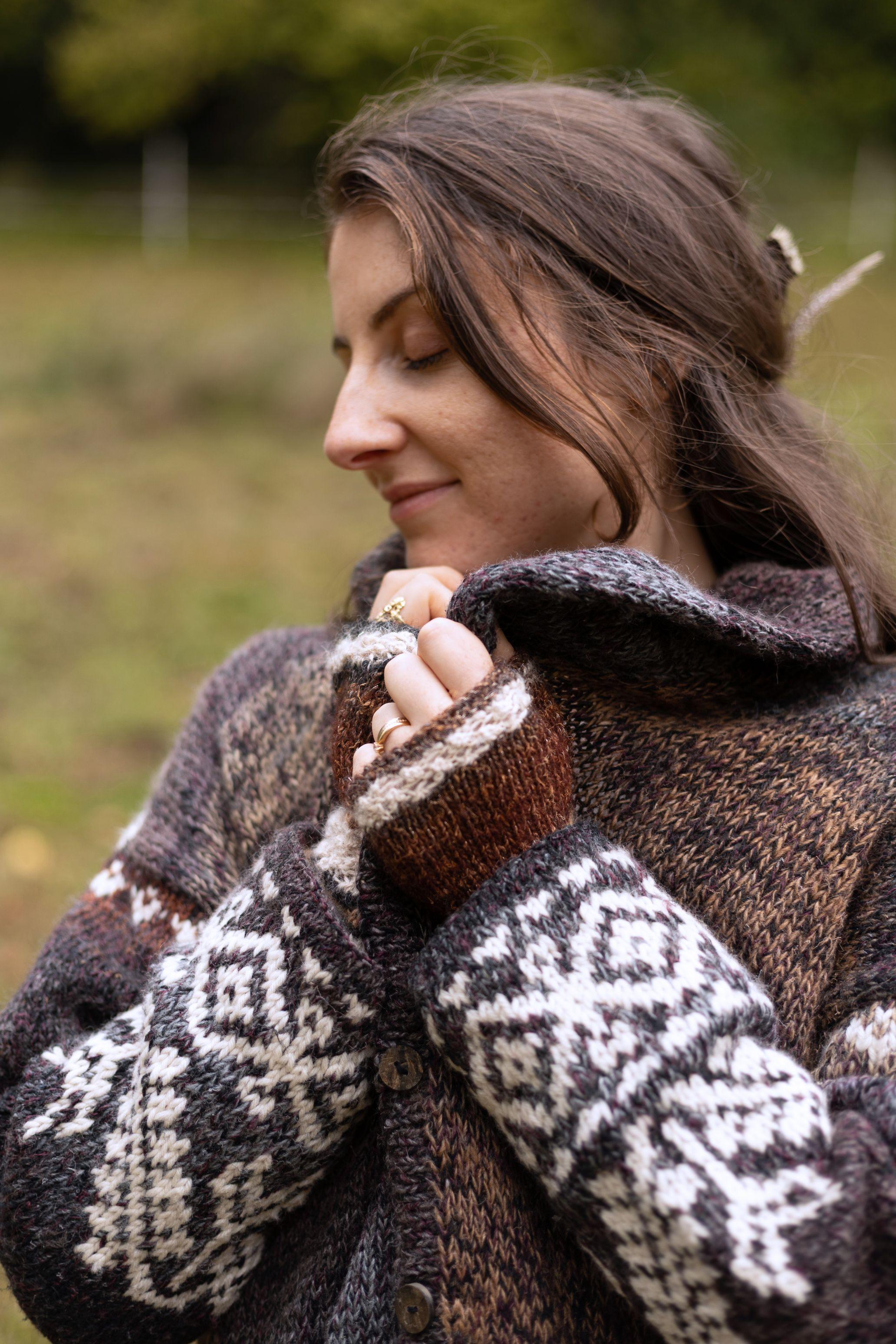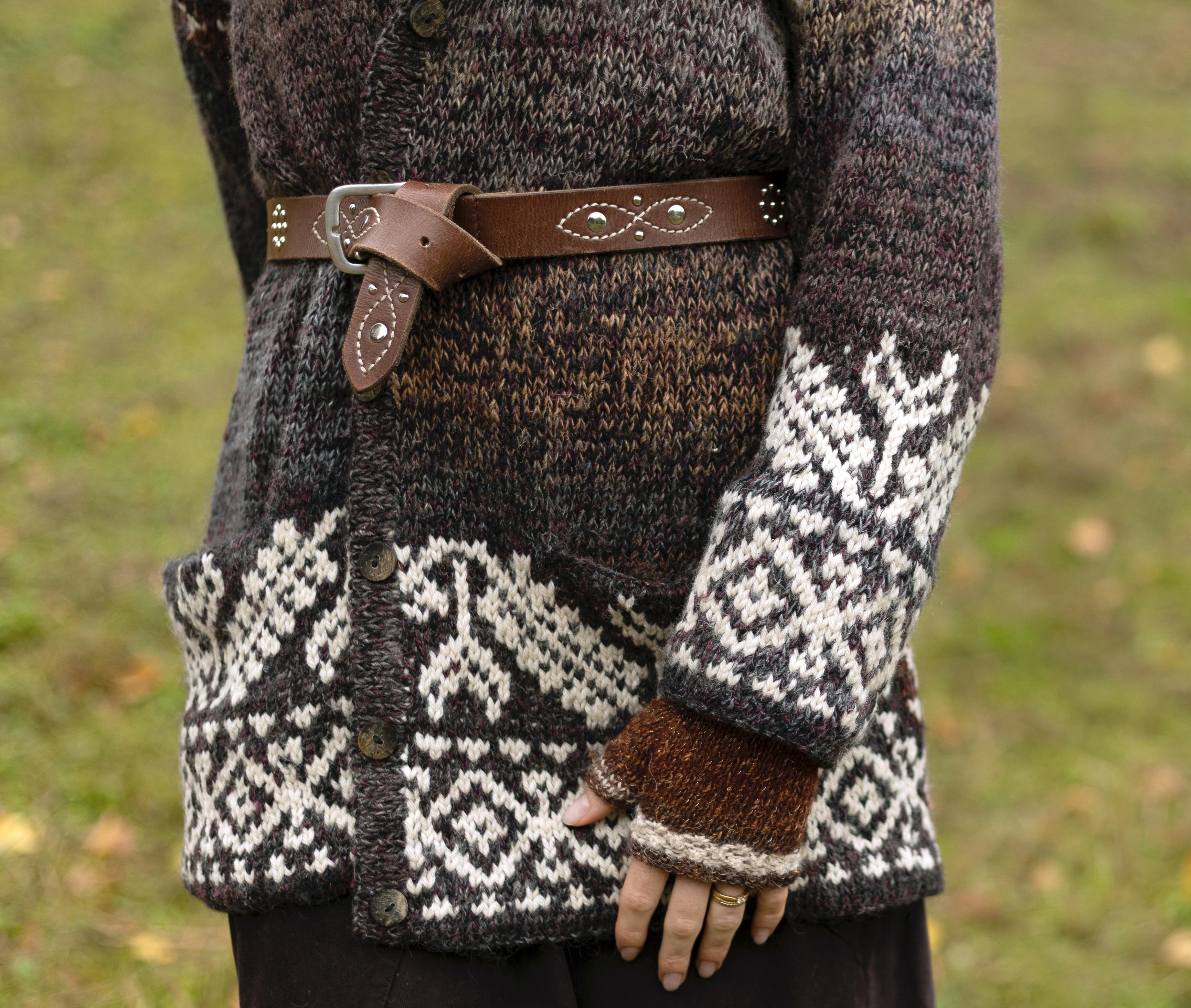La veste Nahele (forêt) se tricote en une seule partie dos et devants jusqu'à l'emmanchure puis se divise pour travailler les différentes parties séparément. Les manches sont tricotées à part.